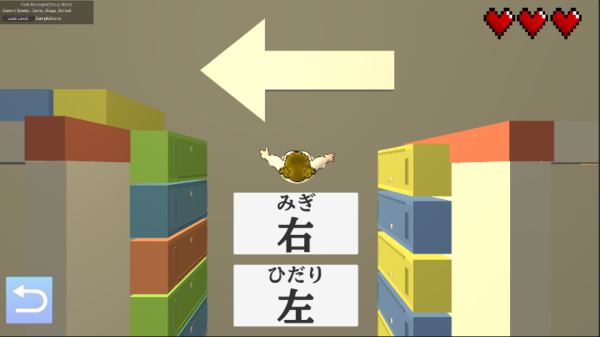 曲がり角に到達した際に出題される問題に対し、矢印の方向を選択することで学校の中を進んでいくステージ。