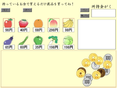 ■お金の計算やおおよその計算(概算)など、実際の生活における算数の活用について訓練するソフトです。