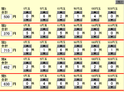 各問の硬貨名の下にある「▲」および「▼」ボタンを押すことで硬貨の枚数を変更することができます。