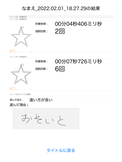 5フェーズの課題を遂行すると、各課題に要した時間が、結果として表示されます。